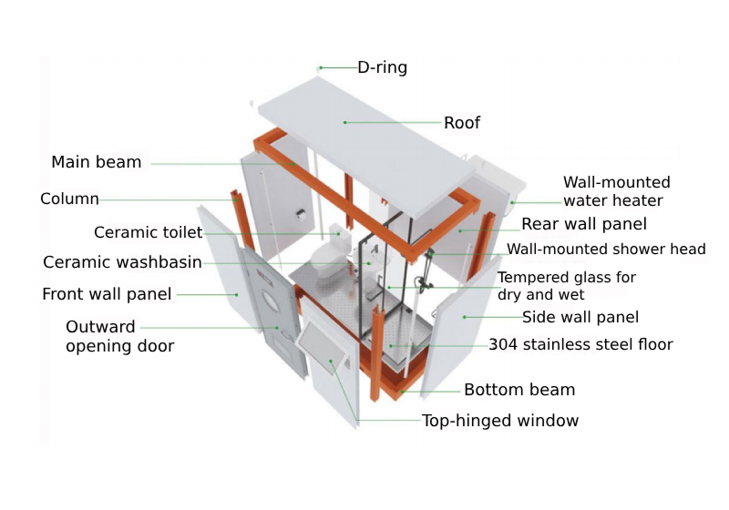 - It features an electrostatic-painted steel frame, color steel foam board walls, and a 304 stainless steel floor.