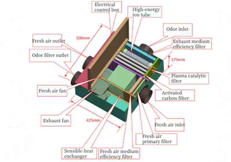 - It features advanced purification technologies including a medium-efficiency filter, high-energy ion purification tube, plasma catalytic net, and natural plant deodorization paste.