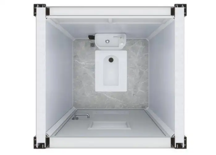 A representative single-unit configuration uses an electrostatic spray-painted steel frame, color steel foam board wall panels, and a marble floor for a cleaner, more solid interior impression. This package combines a ceramic squat toilet with a ceramic integrated wash basin and flushing tank to enhance hygiene and cut odors associated with poor rinsing or limited water access.