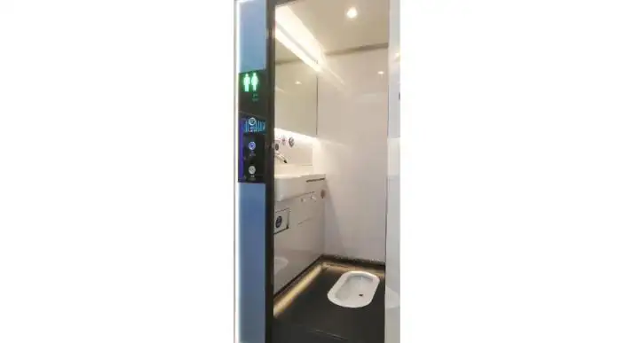 •The squat cabin measures about 1065 mm (L) x 900 mm (W) x 1960 mm (H), preserving ergonomics for squat use. Across models, climate and air quality are handled by an integrated AC (about 0.4 kW within a 0.6 kW total), a fresh air system, and active deodorization.